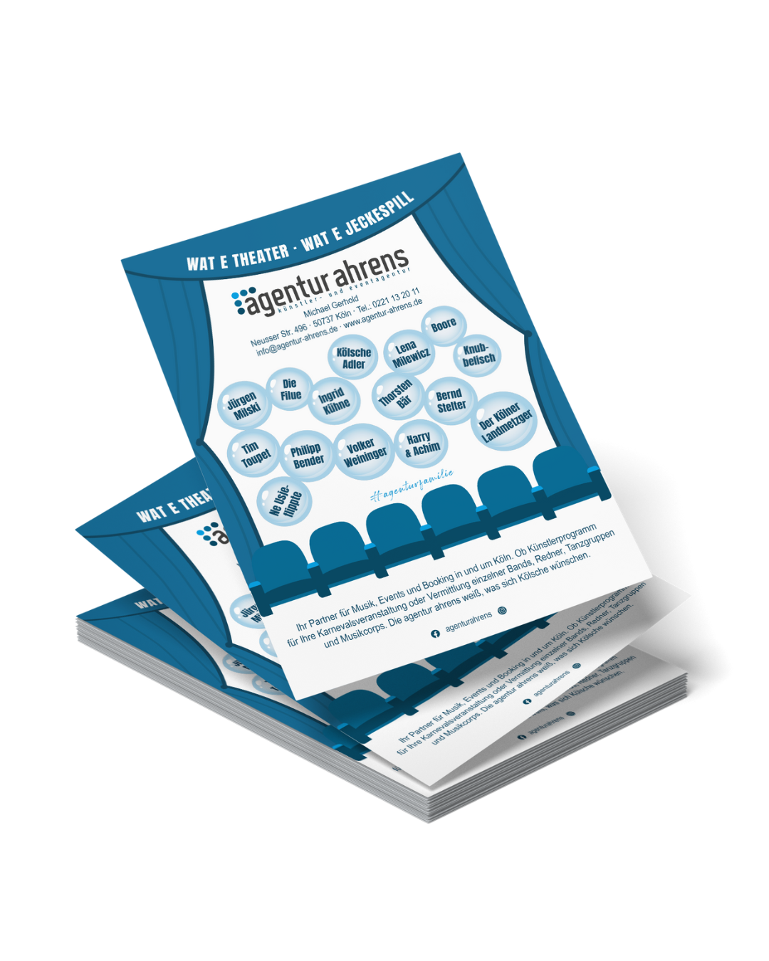 Wir erstellen für Sie gerne ein modernes Layout, das Ihren Leistungen und Ansprüchen gerecht wird. Zu unseren Dienstleistungen gehören beispielsweise das Gestalten von Flyern, Plakaten, Bannern, Imagebroschüren sowie Grafiken für Ihre Social-Media-Kanäle. Hier zeigen wir Ihnen einen kleinen Auszug aus unseren Gestaltungen.