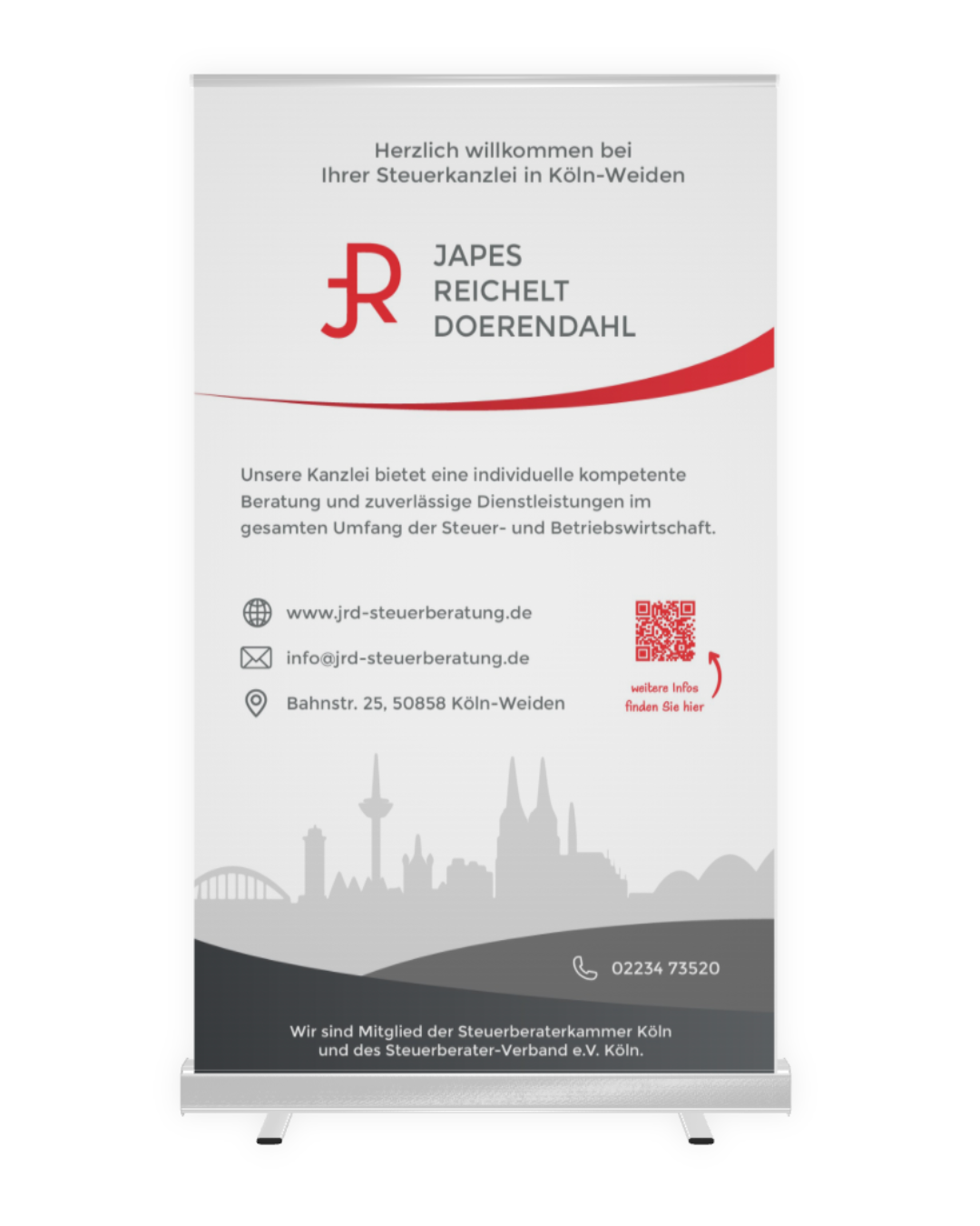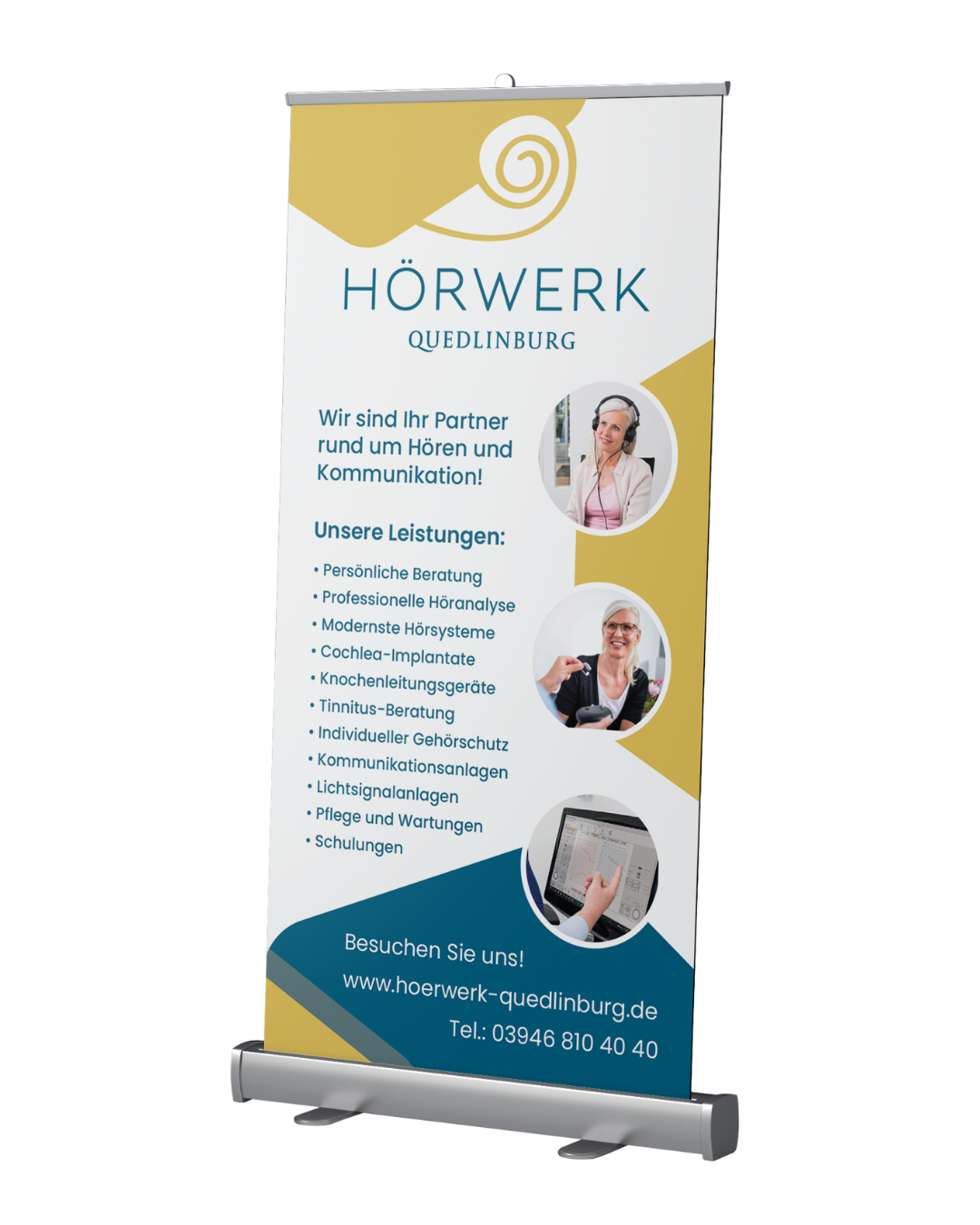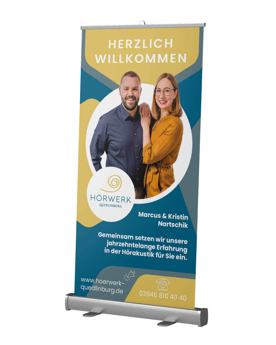 Roll-Up-Banner sind wiederverwendbare, mobile Aufsteller, mit denen Sie Ihr Unternehmen einfach und für alle sichtbar in Szene setzen können.